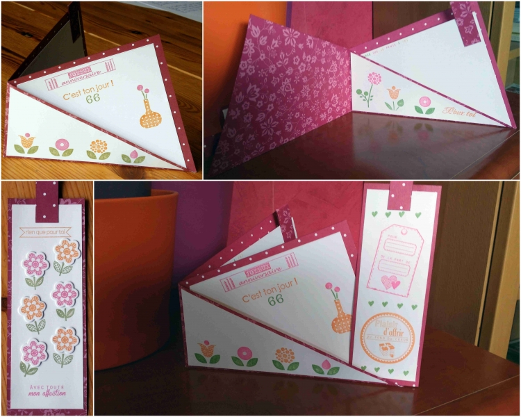 | Carte trapèze et son marque-page, réalisés pour un anniversaire. Pas de difficulté particulière pour ce modèle généralement apprécié pour son originalité.